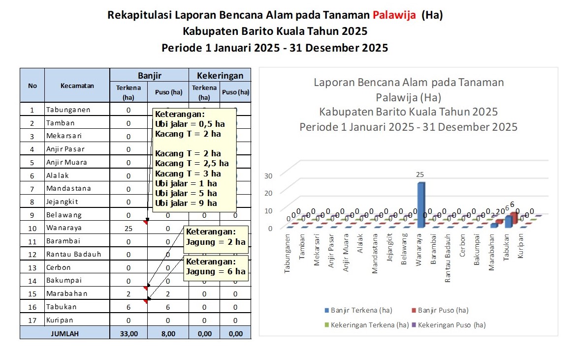 Bencana alam yang terjadi meliputi berdasarkan historis data ada 4, yaitu : Kebanjiran, Kekeringan dan Kebakaran, Roboh Angin. hal ini menyebabkan kerusakan tanaman pangan dan hortikultura.
