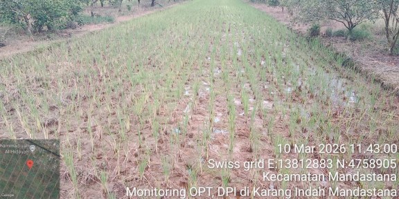 Pengamatan OPT-DPI Padi Siam MK 2026 di Desa Karang Indah Kecamatan Mandastana. Keadaan Tan padi unggul sebagian besar sudah panen lainnya menunggu panen untuk padi lokal sebagian mulai tanam, OPT masih aman.